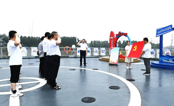 在“洪澤湖號補(bǔ)給艦”甲板層,全體黨員和入黨積極分子舉起右拳,面向黨旗莊嚴(yán)宣誓,誓為黨的事業(yè)奮斗終身。
