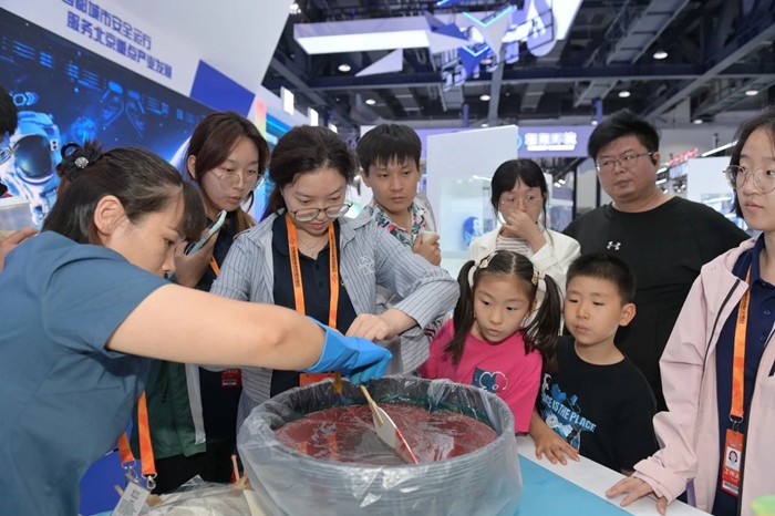 在展位現(xiàn)場,有的觀眾對于展示的儲氫瓶內膽專用材料高度關注,并有強烈的合作意愿,有的觀眾對展示的軟包裝膠黏劑主動提出市場開發(fā)合作意向,還有很多觀眾帶著孩子逐一學習觀摩展出的化工領域創(chuàng)新產品。可以說,化工集團的主題展位既是商業(yè)合作的溝通交流平臺,又是了解化工、學習知識的科普教育平臺。