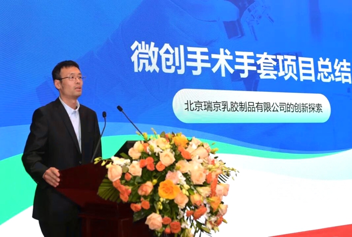 北京瑞京公司研發(fā)工程師仇維高介紹了“雪蓮”微創(chuàng)手術手套創(chuàng)新研發(fā)過程。